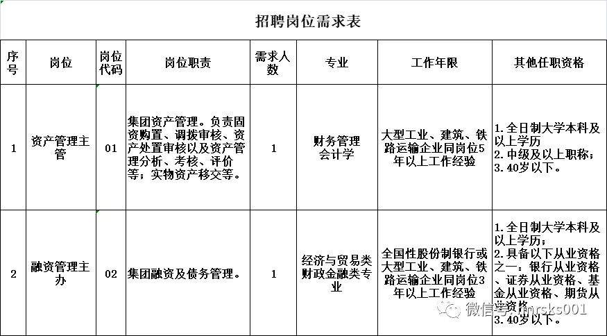 (五)工作经验:主管岗位要求大型工业、建筑、铁路运输企业同岗位5年以上工作经验,主办岗位要求大型工业、建筑、铁路运输企业同岗位3年以上工作经验,工作年限按足年足月累计计算,以2020年12月31日为截止日期,不包括在校期间的社会实践、实习、兼职等经历具体要求以附件:《招聘岗位需求表》为准。