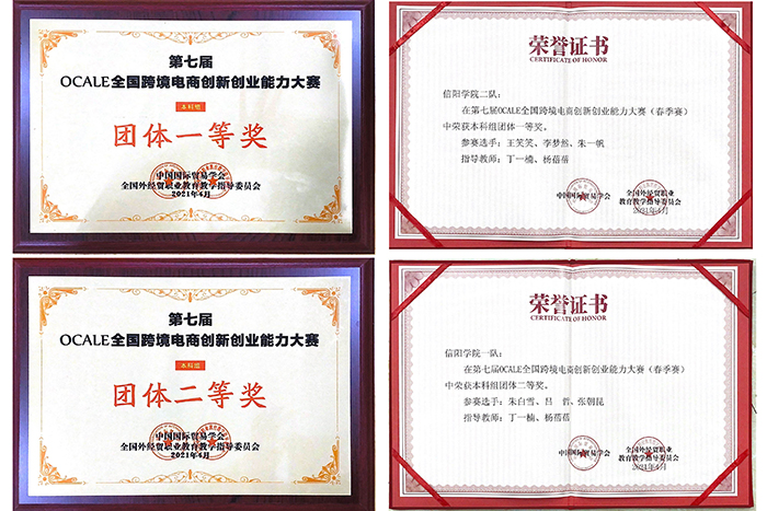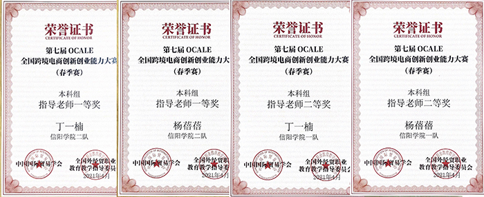 近日,由中国国际贸易学会、全国外经贸职业教育教学指导委员会主办的第七届OCALE全国跨境电商创新创业能力大赛圆满落幕。我校两支代表队在商学院教师丁一楠、杨蓓蓓的带领下,经过三天激烈比拼,从来自全国27个省市、自治区,300所院校、1062支队伍中脱颖而出,分别荣获团体一等奖和团体二等奖。