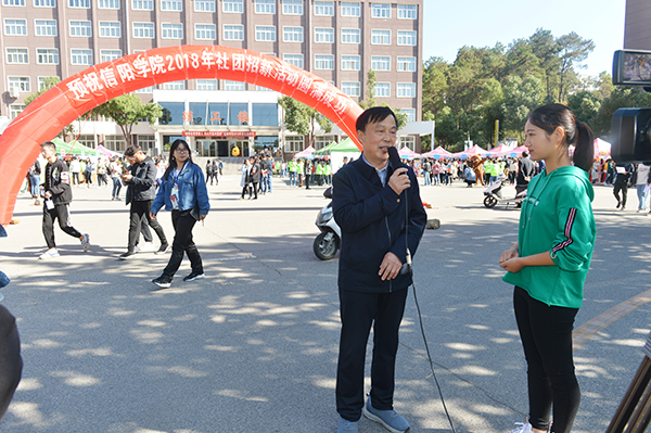 阳光明媚,秋高气爽,10月27日上午,“缤纷社团育新人,同心共筑中国梦”学校2018年社团招新活动在理工楼广场隆重举行。校党委专职副书记施昌海、副校长王志华在有关部门负责人李肖利、余婷婷、郑山峰的陪同下莅临社团招新现场,指导社团招新工作。部分学院党总支书记张富庄、李赟、张红梅,各学院学生工作负责人、团总支书记、社团指导教师、学生社团联合会负责人共同组织了社团招新活动。58个学生社团负责人和大一新生参加了本次招新活动。