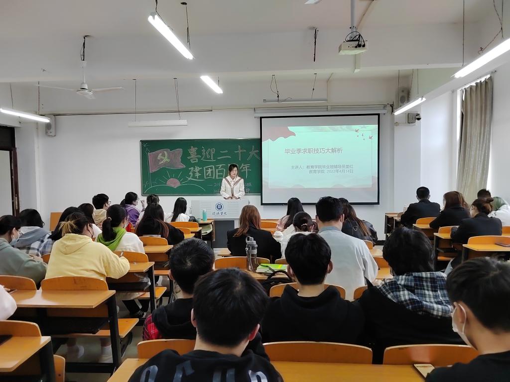 为促进我院毕业生实现高质量就业, 4月14日下午教育学院辅导员姜红为2018级毕业生代表分享了主题为“毕业季求职技巧大解析”的专题宣讲会。