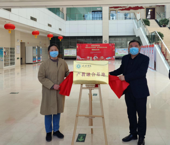 在热烈的掌声中,胡宝强与张瑞瑞为“产教融合基地”揭牌。朱进与张瑞瑞签订产教融合合作协议。