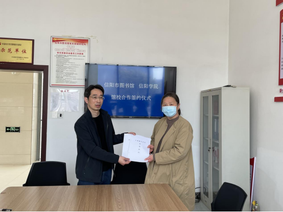 4月6日,我校与信阳市图书馆产教融合签约仪式在信阳市图书馆举行。信阳市文化广电和旅游局副局长胡宝强、信阳市文化广电和旅游局公共服务科科长刘义俊、信阳市图书馆馆长朱进、信阳市图书馆副馆长李达冉、信阳学院美术与设计学院院长张瑞瑞、教学副院长王伟出席仪式。美术与设计学院视觉传达设计教研室主任何伟以及部分教师代表参加了签约仪式。