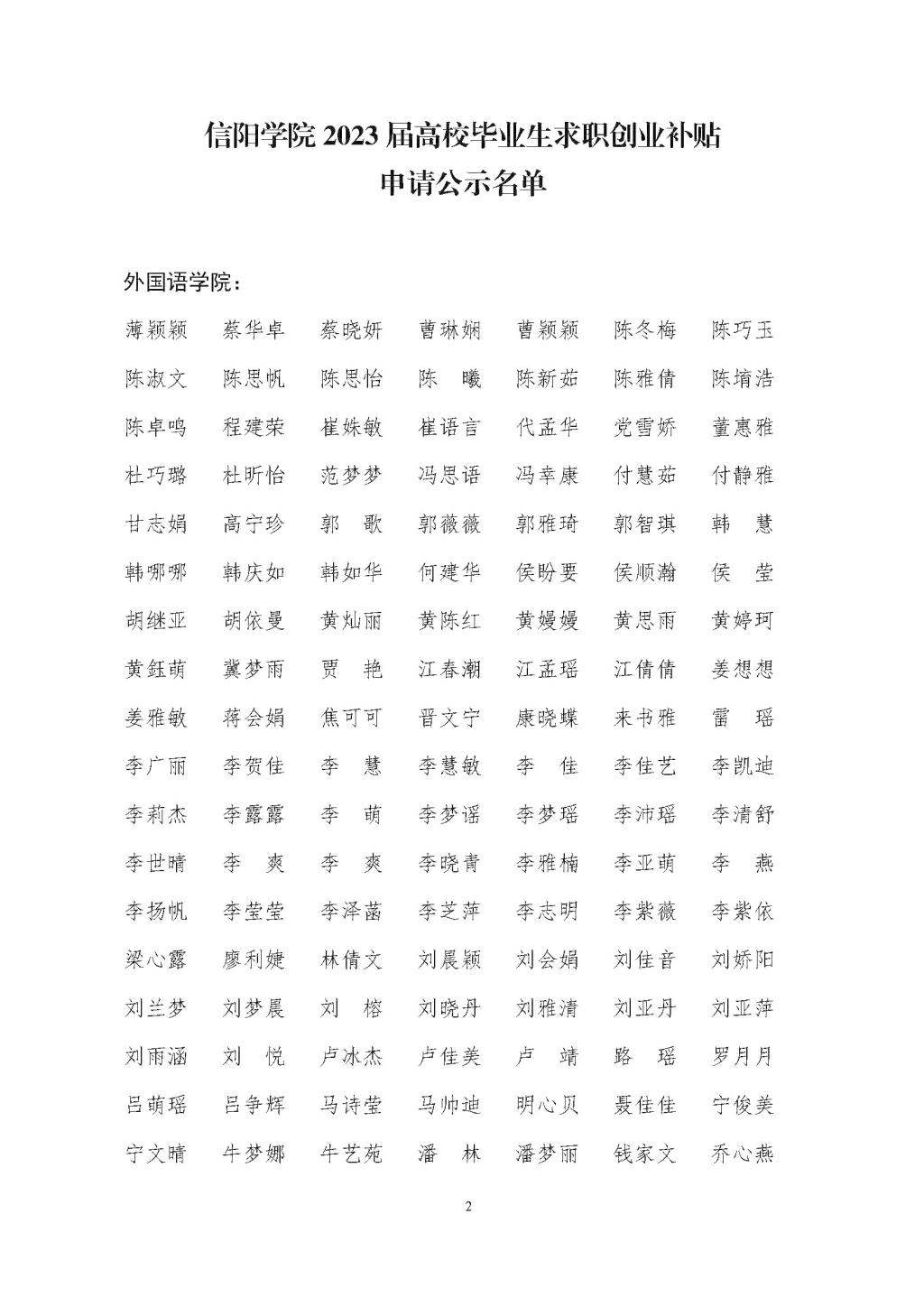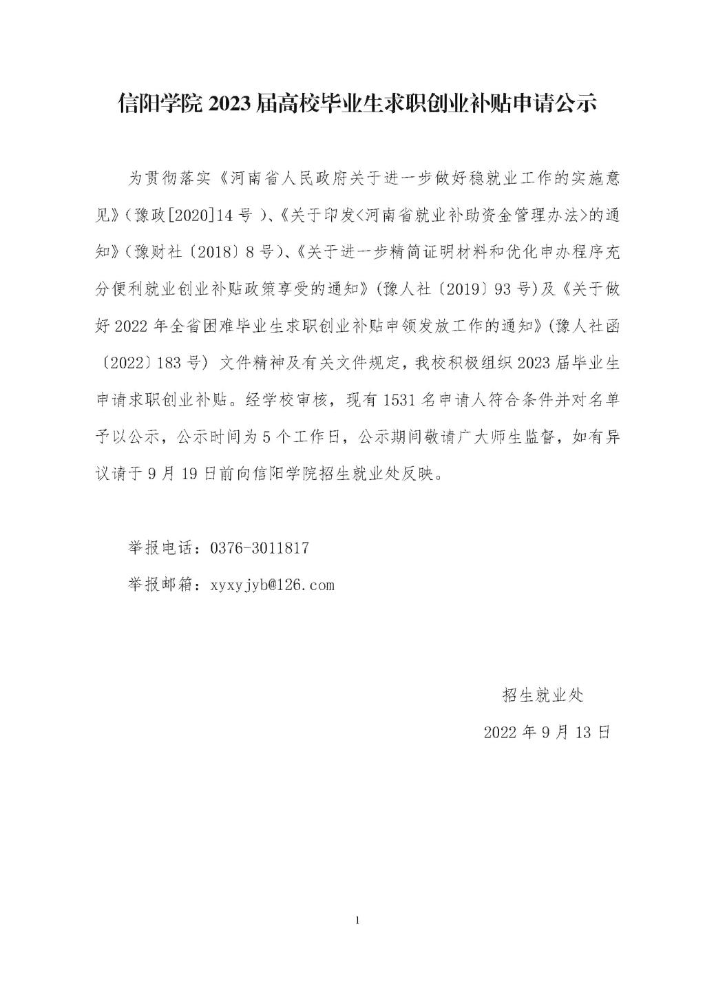 信阳学院2023届高校毕业生求职创业补贴申请公示