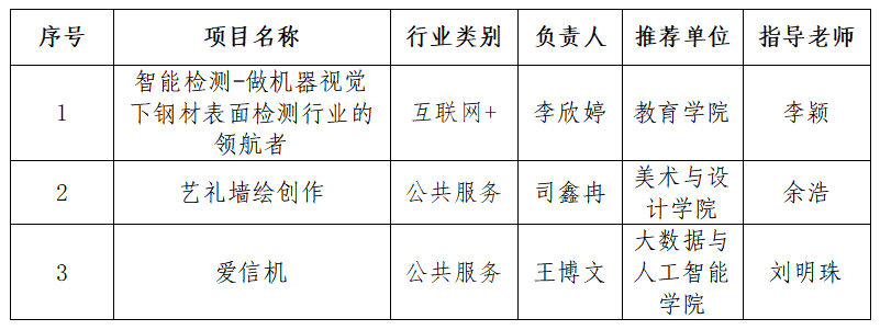 2025年3月,经创业团队申请、学院推荐、项目现场路演答辩、学校评审等程序,拟确定3个项目入驻学校众创空间,现将名单(附后)进行公示,自公示之日起三日内,如对入驻项目有异议,可以书面形式提出。须在异议材料上签署真实姓名,并写明联系电话。不符合上述要求的异议,不予受理。